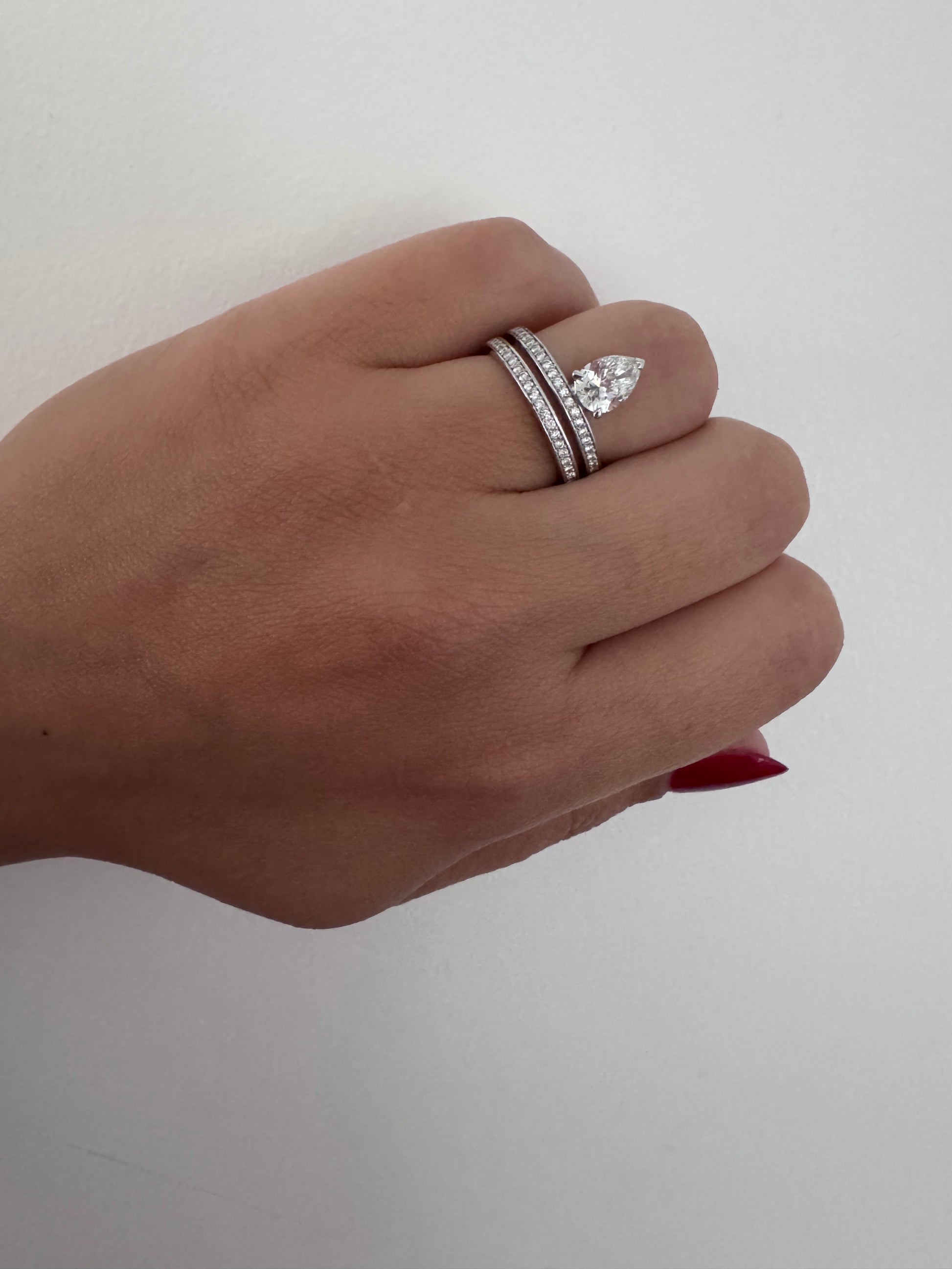 Un duo intemporel. Le solitaire taille poire se pose avec élégance sur une monture en or blanc, accompagné d’un anneau pavé pour un éclat continu. Un style classique revisité avec raffinement.