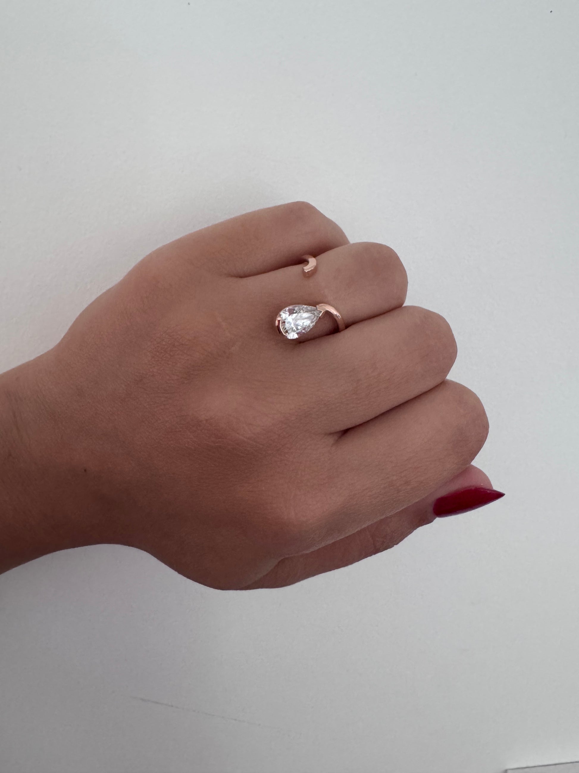 Une création aérienne où la lumière et l’or se rencontrent dans un équilibre parfait. Cette bague au design audacieux s’ouvre délicatement en son centre, laissant flotter un diamant taille poire de 2 carats, tel une goutte de lumière suspendue sur la peau. Son éclat pur et fascinant semble défier la gravité, captant chaque reflet avec une intensité rare.