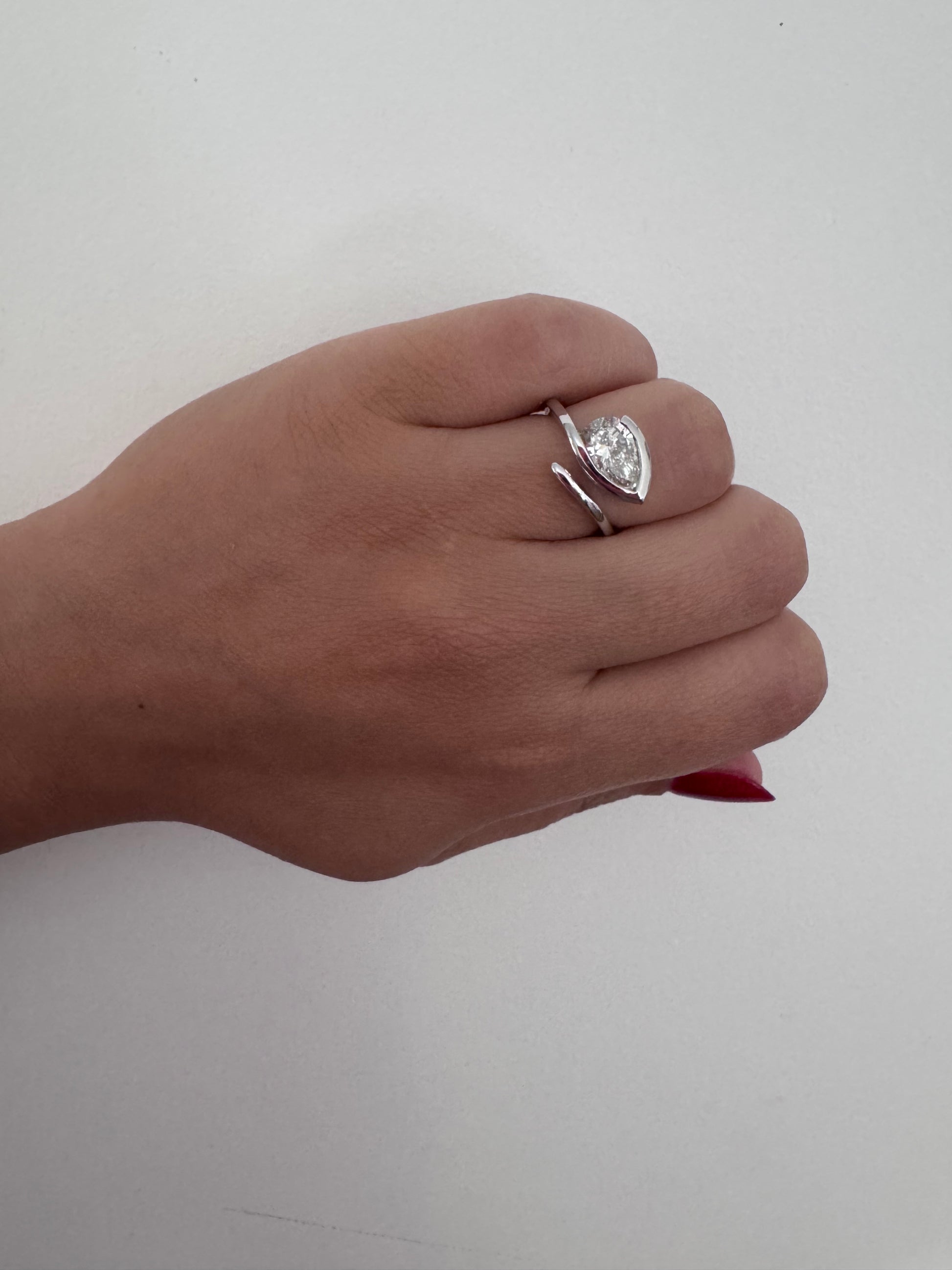 Un design saisissant, où le regard se perd dans l’éclat d’une pierre fascinante. Cette bague met en scène un diamant taille poire de 2 carat, positionné à l’horizontale pour une silhouette avant-gardiste et hypnotique. Son serti bézel ouvert, finement travaillé en or 18 carats, encadre délicatement la pierre tout en laissant son dos visible, offrant une transparence et une lumière saisissantes.